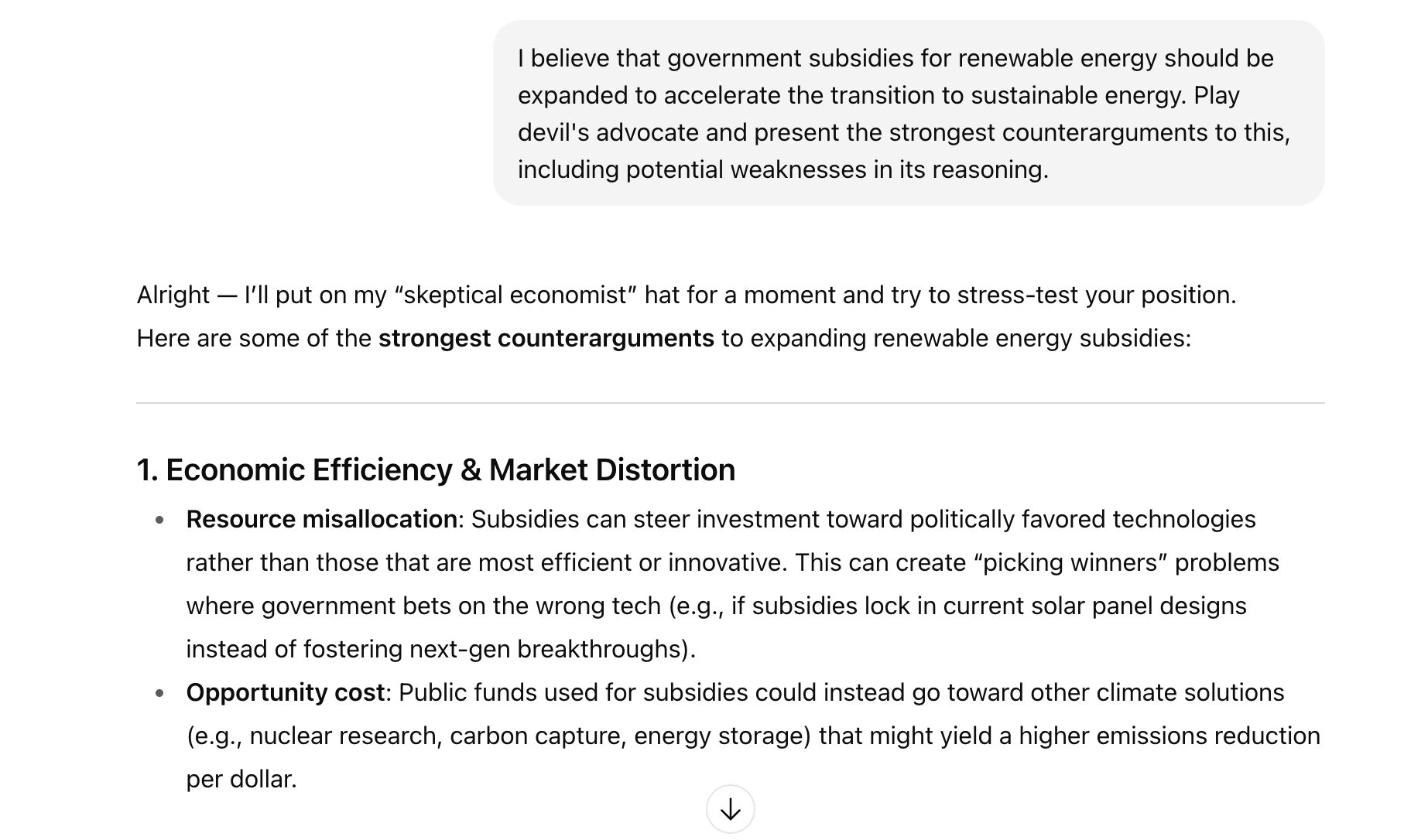 Unser Profi-Tipp: Wenn du dein Thesenargument entwickelst, bitte ChatGPT, deine Position zu hinterfragen, indem du prompts: „Ich glaube [Argument/Position]. Spiele den Advokaten des Teufels und präsentiere die stärksten Gegenargumente dazu, einschliesslich möglicher Schwächen in der Argumentation.” Schau dir unser Beispiel an: