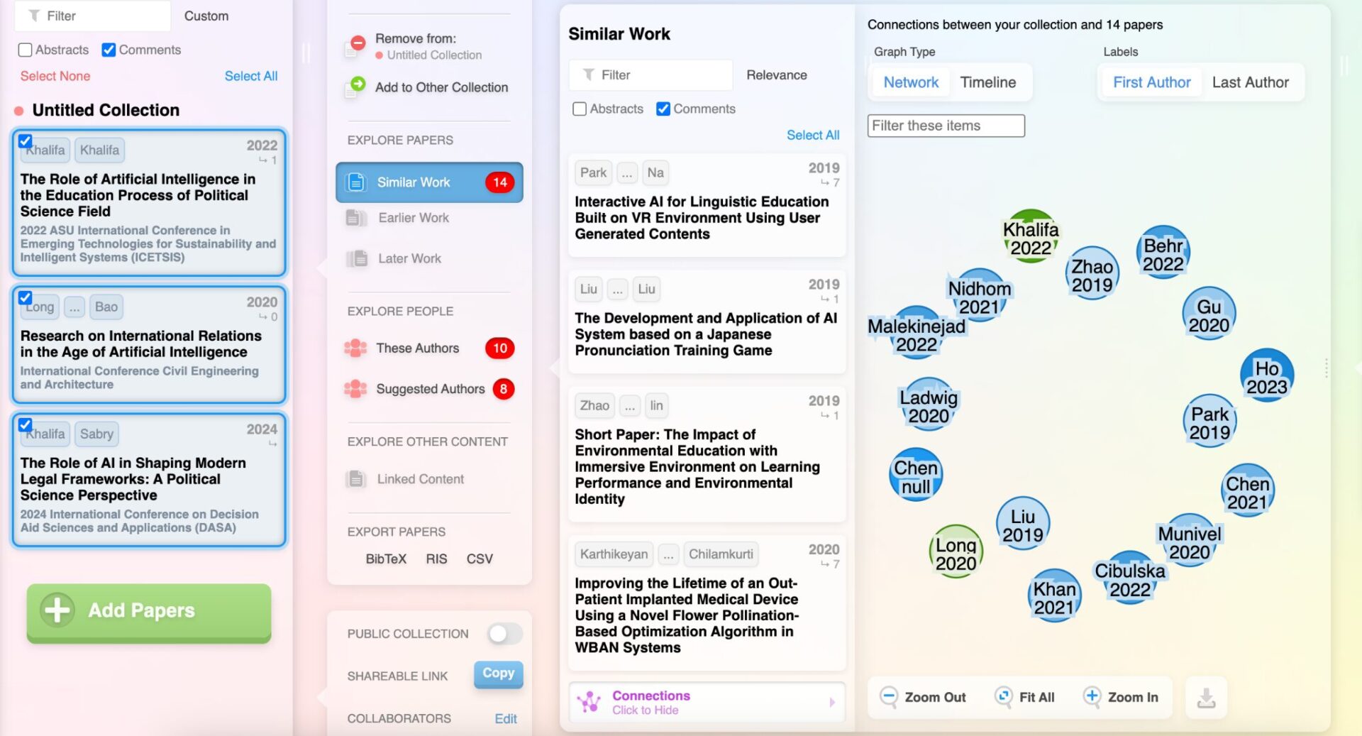 Unser Profi-Tipp: Beginne mit 2-3 Arbeiten, von denen du bereits weisst, dass sie für dein Forschungsthema von zentraler Bedeutung sind. Lass Research Rabbit das Netzwerk um sie herum aufbauen und verwende dann die Funktion “Sammlungen”, um verschiedene Themenbereiche zu organisieren. Schau dir unser Beispiel an: