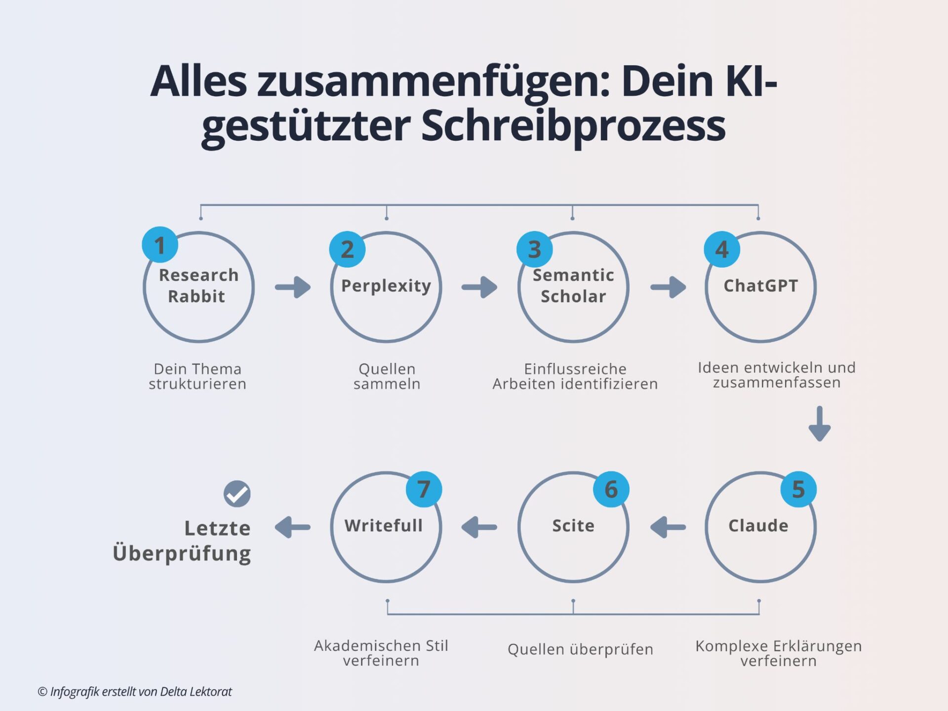 Diese sieben KI-Tools repräsentieren verschiedene Phasen des akademischen Schreibprozesses – von der ersten Forschungsentdeckung bis zur endgültigen Verfeinerung des Schreibens. Es gibt zwar auch andere vielversprechende Werkzeuge, aber wenn du zuerst dieses Grundset beherrschst, erhältst du eine solide Grundlage. Abschliessend haben wir einen Workflow zusammengestellt, dem du folgen kannst. Beachte, dass er nicht immer linear verwendet werden sollte. Während sich deine Forschung weiterentwickelt, wechselst du zwischen Entdeckung, Analyse und Verfeinerung hin und her.