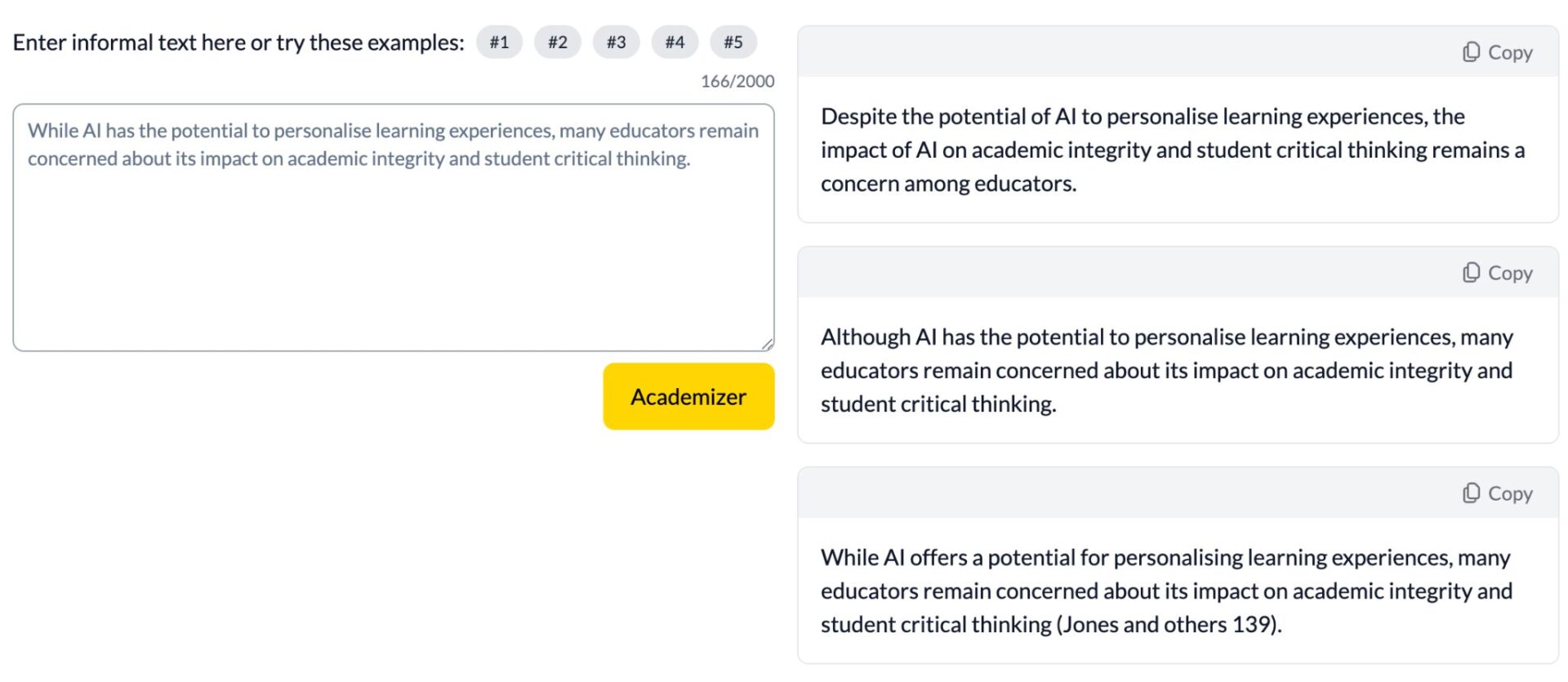 Unser Profi-Tipp: Verwende den Academizer von Writefull, um informelle oder allgemeine Sätze sofort in eine ausgefeilte akademische Sprache umzuwandeln. Füge einen Entwurf ein und sieh, wie er formellere, disziplingerechte Alternativen vorschlägt, die den wissenschaftlichen Schreibstandards entsprechen. Hier ist ein Beispiel: