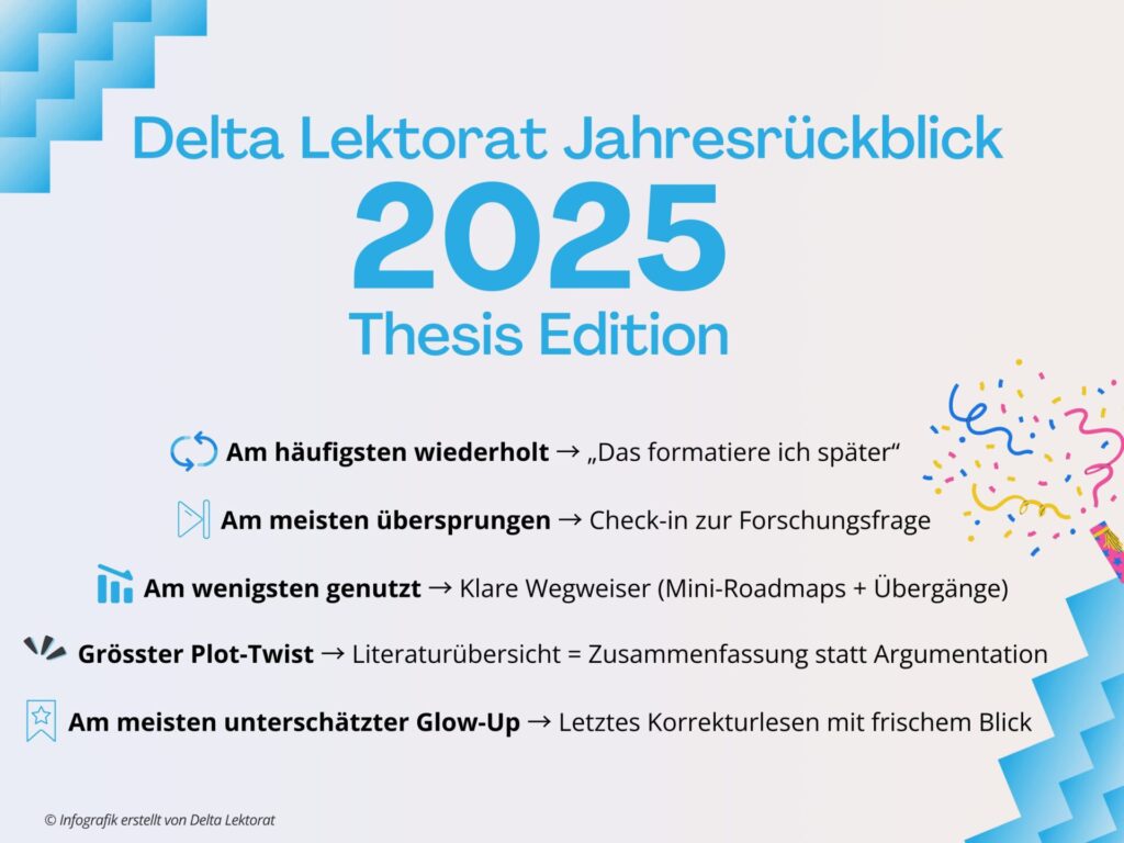 Neues Jahr, neue Schreib-Energie! Willkommen beim Delta Lektorat Jahresrückblick 2025: ein Rückblick auf die Muster, die dieses Jahr immer wieder in Entwürfen von Abschlussarbeiten aufgetaucht sind, und die Upgrades, die sich lohnen, mit ins Jahr 2026 zu nehmen.