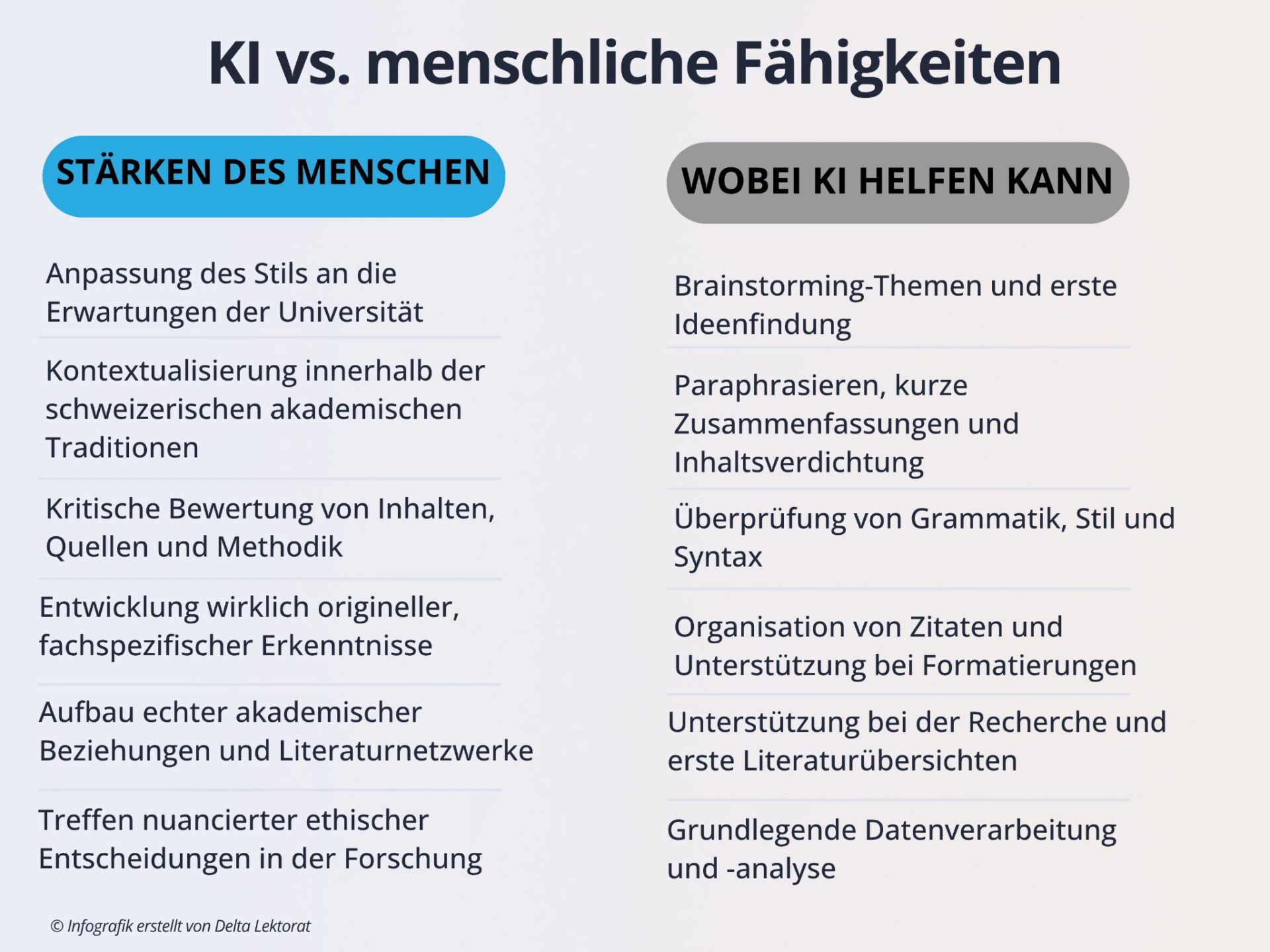 Wir haben eine Vergleichstabelle erstellt, die aufzeigt, worin KI stark ist und wo der Mensch unersetzlich bleibt. Da KI-Tools zunehmend in der akademischen Welt integriert werden, ist es für Studierende entscheidend, die jeweiligen Stärken beider Seiten zu verstehen. Der effektivste Ansatz besteht nicht darin, KI als Ersatz für menschliches Fachwissen zu sehen, sondern als kraftvolle Ergänzung zu den einzigartigen Fähigkeiten, die nur Menschen besitzen.