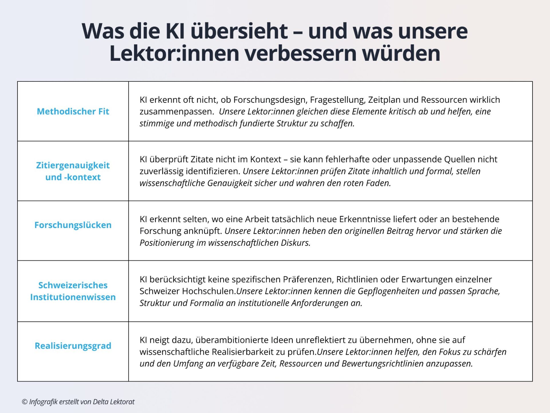 Es ist wichtig zu hervorheben, dass der Unterschied zwischen KI-Unterstützung und menschlicher Expertise nicht nur eine Frage der Qualität ist, sondern des Verständnisses für die ungeschriebenen Regeln der Schweizer Wissenschaftskultur. Hier sind einige Beispiele dafür, was unsere Lektor:innen wahrnehmen, das KI regelmässig übersieht: